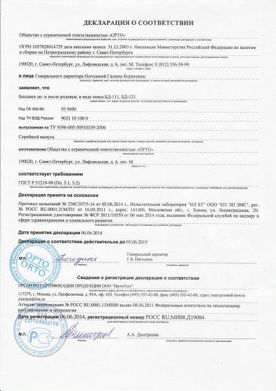 Бандаж для беременных и женщин в послеродовом периоде, с разъемной эластичной основой анатомической формы и парой эластичных ремней, фиксированных к центральной части изделия. Высота ортеза: 15-20 см в зависимости от размера. По краям основы и на концах ремней расположена застежка «Велкро».